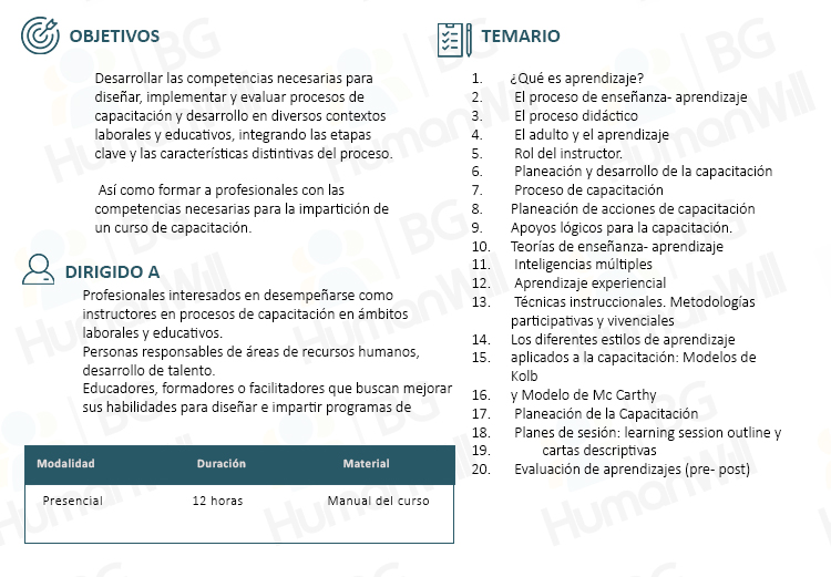 Curso orientado a que los participantes comprendan, desarrollen e implementen procesos de enseñanza-aprendizaje, identificando sus etapas y características, para diseñar capacitaciones efectivas y estructuradas en diversos contextos formativos.